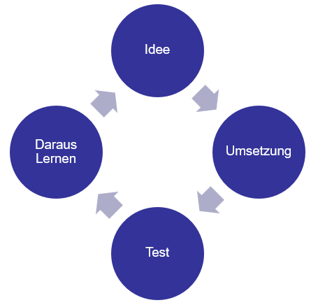 Stelle auf einer leeren Folie den Prozess «Idee -> Umsetzung -> Test -> Daraus Lernen» visuell dar. Du kannst, musst dich dabei aber nicht an der untenstehenden Abbildung orientieren.