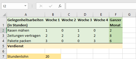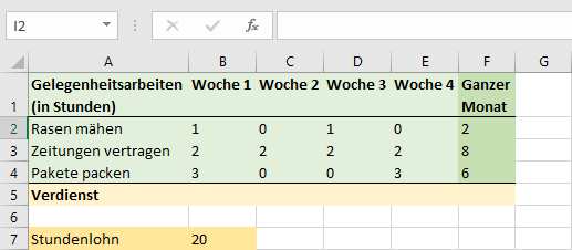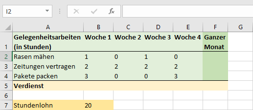 Berechne in der Spalte «Ganze Woche» die Summe der Vorarbeitsstunden per Formel.