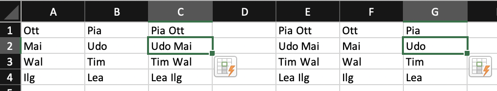 Die Spalten F und G wurden umgekehrt aus der Spalte E erstellt. Dazu wurde z.B. in die Zelle F1 das Beispiel «Ott» geschrieben, wiederum Enter gedürckt und über Daten > Blitzvorschau die Spalte F erstellt. Analog wurde die Spalte G erstellt.