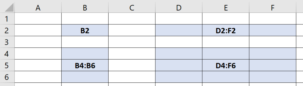Eine einzlene Zelle wird per Zeile und Spalte angesprochen (z.B. B2). Soll ein Zellbereich aus mehreren Zellen angesprochen werden, so werden die Zellen per Doppelpunkt : zusammengefasst. In Abb.1 sind mehrere Beispiele zu sehen. Z.B. bezeichnet «D4:F6» die neun eingefärbten Zellen um D4:F6 herum.